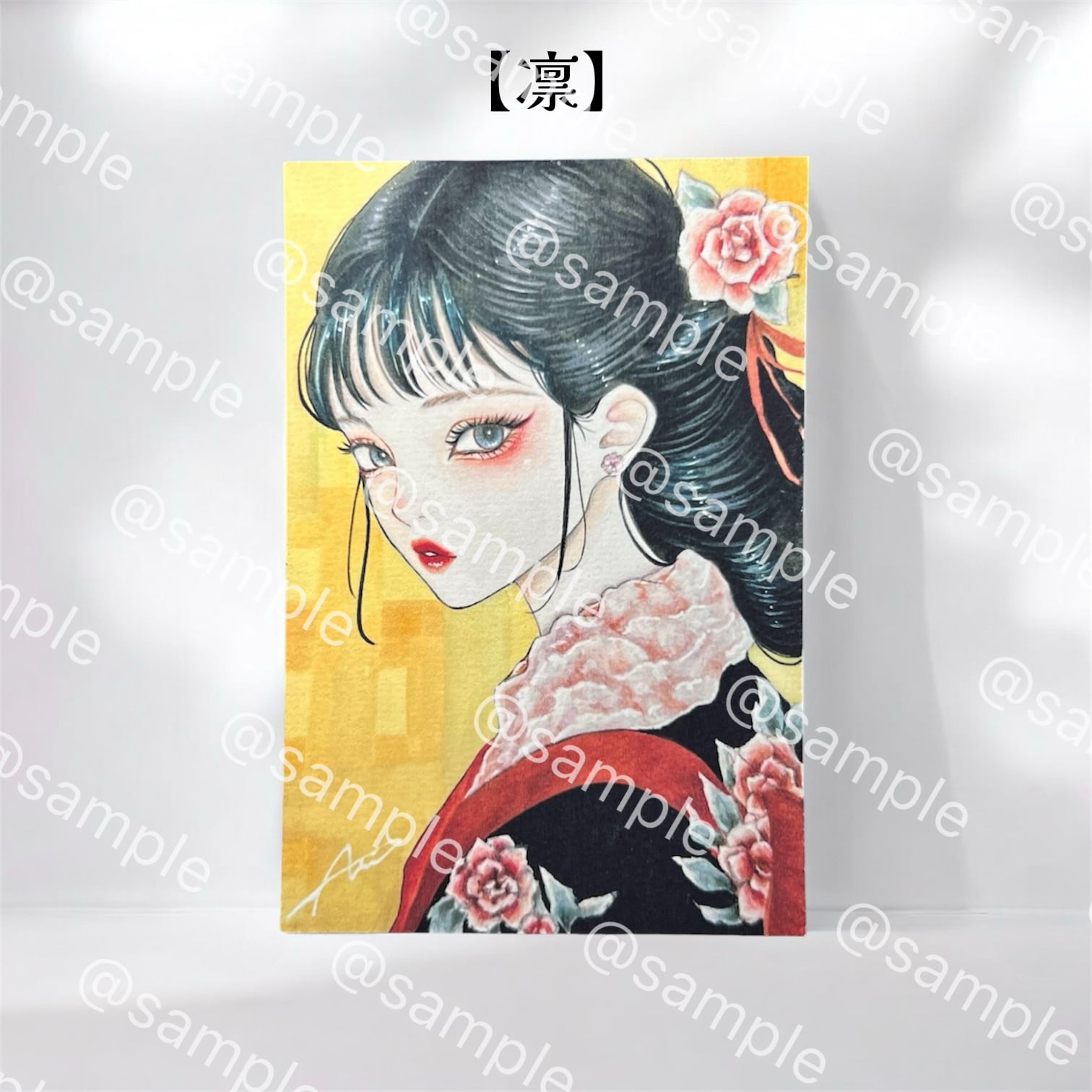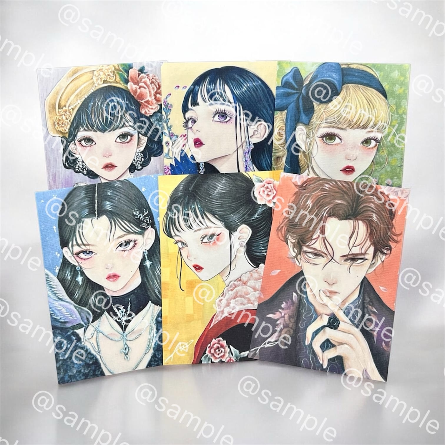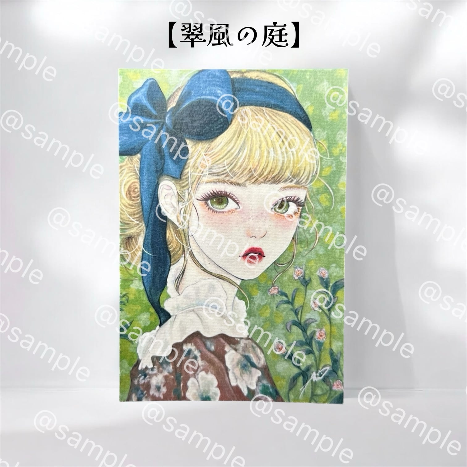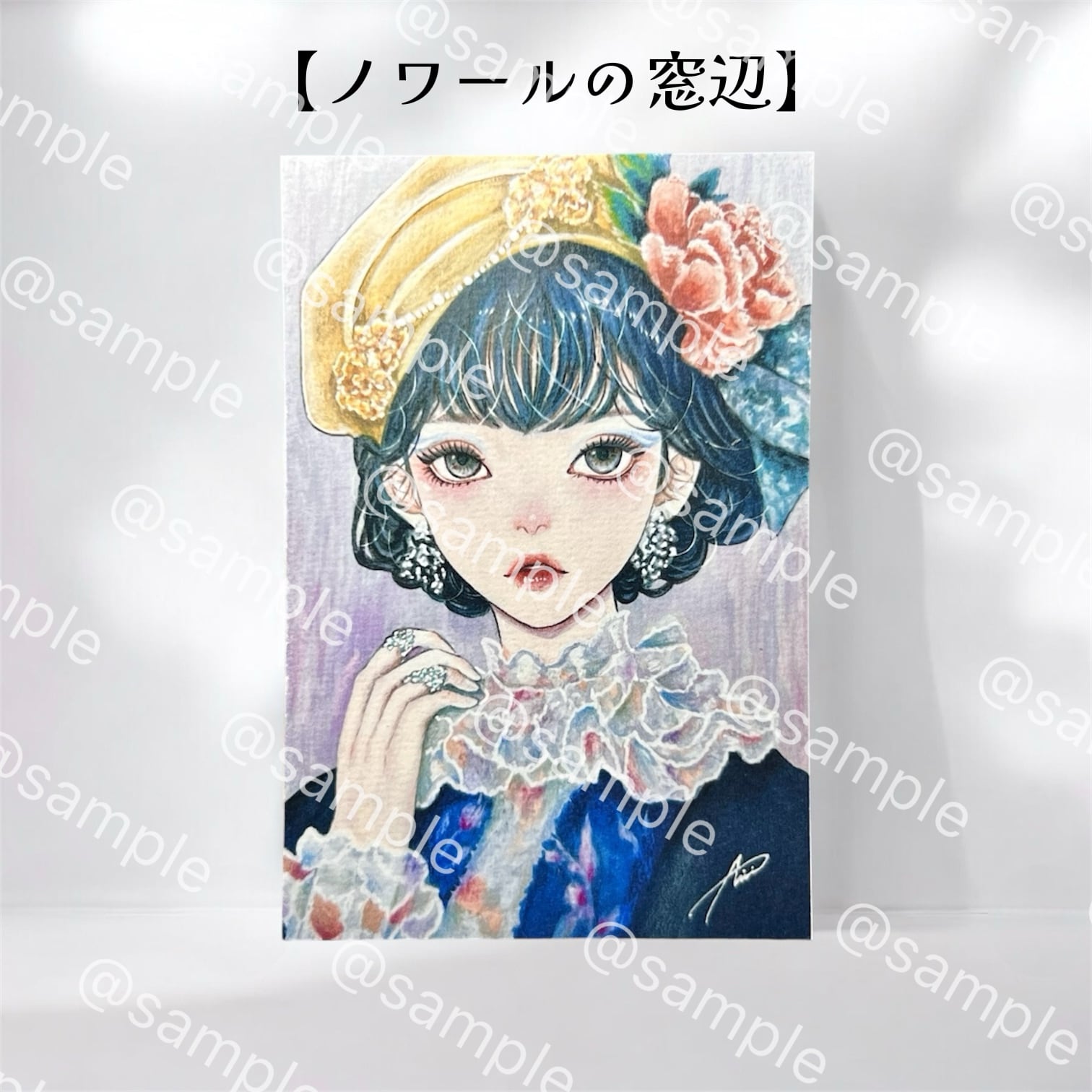 原画シリーズ II《ノワールの窓辺》《硝子の瞳》《翠風の庭》《夜想鳥》《凛》《仄紅》のポストカード各1枚ずつ、計6枚のセットです。6つの世界観を一度にお楽しみいただける特別なセットです。